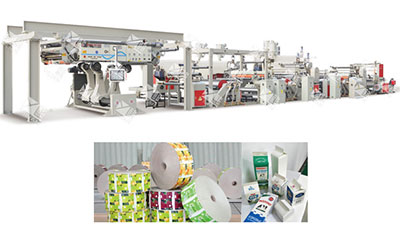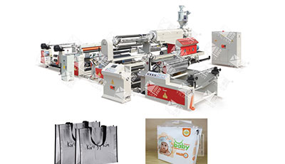 復合淋膜機 整機由加料裝置、擠出機主機、模具、放卷機構、復合機構、收卷機構、邊位控制裝置、切邊裝置、加熱冷卻系統(tǒng)、電氣測控系統(tǒng)等部分組成。根據(jù)不同制品需要可添加第二放卷機構、印刷設備、烘箱、基材表面處理裝置、在線測厚儀等組成部分。